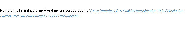 Ancienne signification développée en 1798 par l’académie Française (ACAD - 1798).Merci à Marc et Odile pour la numérisation du mot immatriculer.