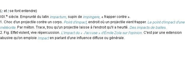 Définition issue du dictionnaire wiktionary pour le mot « impact ».Merci à Sébastienne et Danièle pour la numérisation du mot impact.