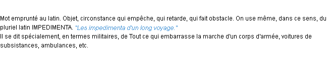 Signification éditée en 1932 pour le terme « impedimentum » par l’Académie Française.