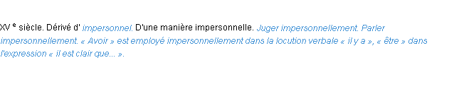 Définition académique pour le terme « impersonnellement » (parue en 1932).