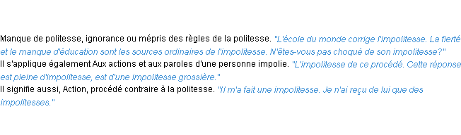 Ancienne signification issue du dico de l’Académie Française, parue en 1798.Merci à Corinne et Sylvianne pour la numérisation du mot impolitesse.