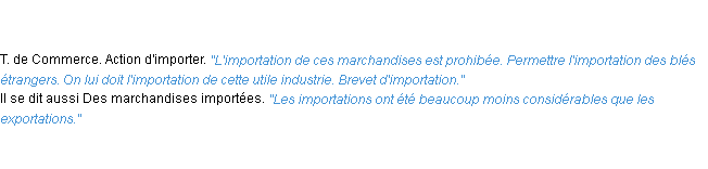 Ancienne définition développée dans dictionnaire académique, 1798.Merci à Jourdain et Claudine pour la numérisation du mot importation.