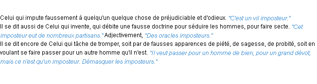 Ancienne signification issue du dico de l’Académie Française, parue en 1798.Merci à Colette et Florentin pour la numérisation du mot imposteur.