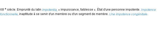 Signification développée en 1876 par Mr Littré (dictionnaire dit d’Emile Littré).Merci à Mathieu et Frédéric pour la numérisation du mot impotence.