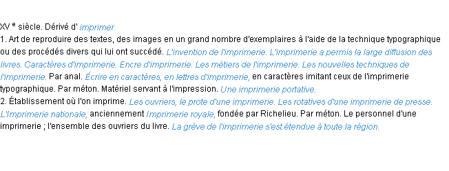 Ancienne signification parue en 1798 dans dictionnaire de l’Académie Française.Merci à Amaury et Adrienne pour la numérisation du mot imprimerie.