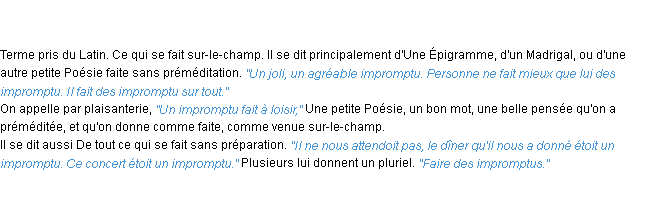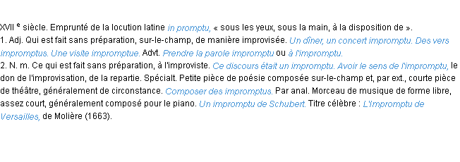 Ancienne signification éditée en 1798 pour le terme « impromptu » par l’Académie Française.Merci à Sébastien et Evrard pour la numérisation du mot impromptu.
