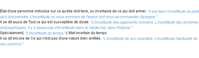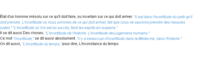 Signification du terme « incertitude », parution de 1932, dictionnaire académique Français.