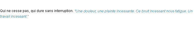 Signification développée en 1876 par Mr Littré (dictionnaire dit d’Emile Littré).Merci à Odile et Perrine pour la numérisation du mot incessant.
