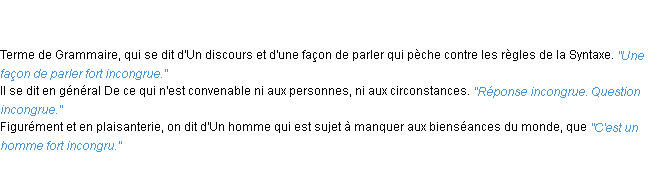 Ancienne signification parue en 1798 dans dictionnaire de l’Académie Française.Merci à Sylvianne et Rémi pour la numérisation du mot incongru.