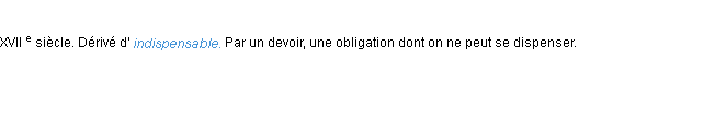 Ancienne signification du terme « indispensablement », parution de 1798, dictionnaire académique Français.Merci à Fabien et Ambre pour la numérisation du mot indispensablement.