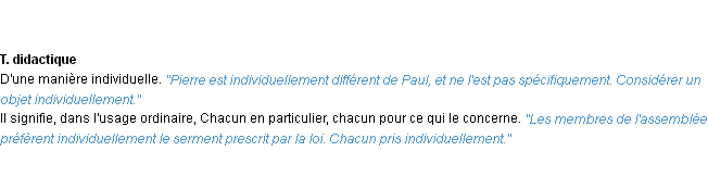 Définition de « individuellement » de source académique (Académie Française, parution de 1986).