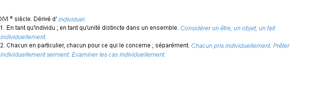 Définition de « individuellement » de source académique (Académie Française, parution de 1932).