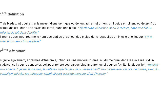Ancienne définition développée dans dictionnaire académique, 1798.Merci à Martine et Sylvie pour la numérisation du mot injecter.