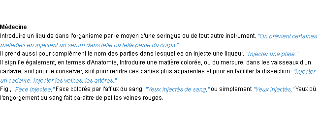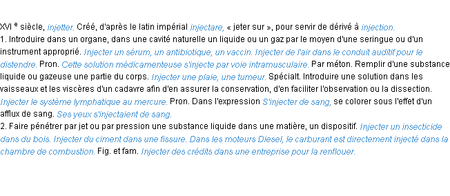 Définition de l’Académie Française (édition de 1932) pour le mot « injecter ».