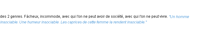 Ancienne signification développée en 1798 par l’académie Française (ACAD - 1798).Merci à Jérôme et Delphine pour la numérisation du mot insociable.