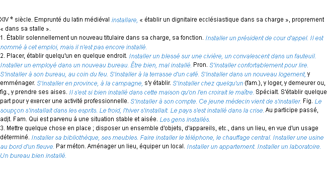 Ancienne signification issue du dico de l’Académie Française, parue en 1798.Merci à Arnaud et Paulette pour la numérisation du mot installer.