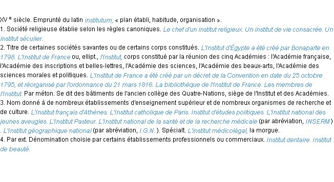 Signification du terme « institut », parution de 1932, dictionnaire académique Français.