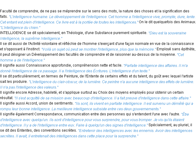 Ancienne signification développée en 1798 par l’académie Française (ACAD - 1798).Merci à Arienne et Céline pour la numérisation du mot intelligence.