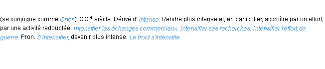 Signification éditée en 2010 par l’équipe de la-definition.fr.Merci à Florette et Edmond pour la numérisation du mot intensifier.