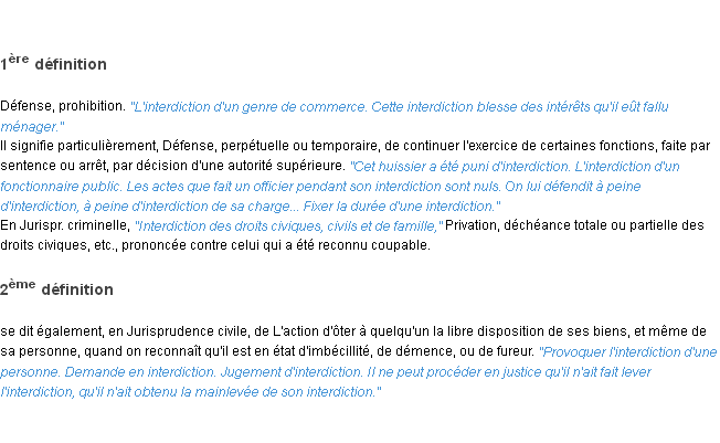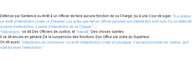 Ancienne signification parue en 1798 dans dictionnaire de l’Académie Française.Merci à Gérard et Fabien pour la numérisation du mot interdiction.