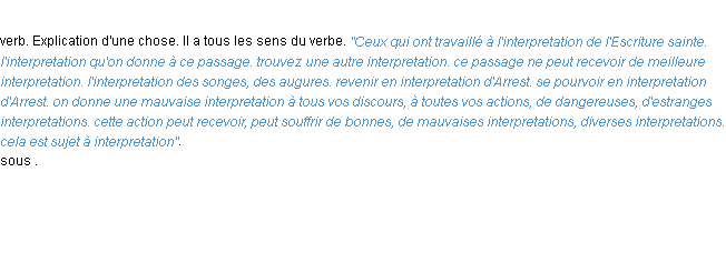 Ancienne signification éditée en 1694 pour le terme « interpretation » par l’Académie Française.Merci à Noé et Ambre pour la numérisation du mot interpretation.