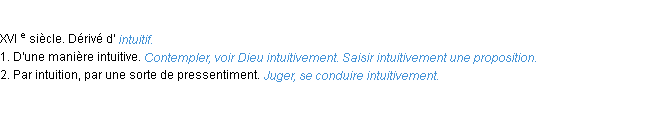 Ancienne signification développée en 1798 par l’académie Française (ACAD - 1798).Merci à Seraphine et Jacques pour la numérisation du mot intuitivement.