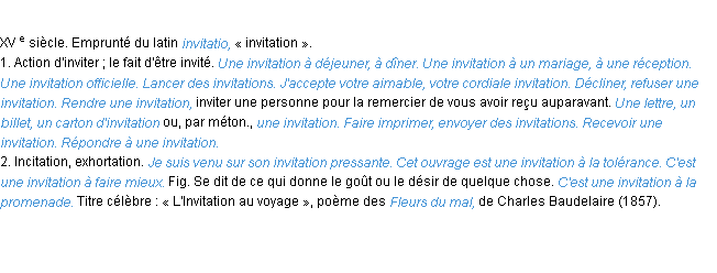 Ancienne définition de « invitation » de source académique (Académie Française, parution de 1835).
