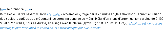 Définition de « iridium » de source académique (Académie Française, parution de 1986).