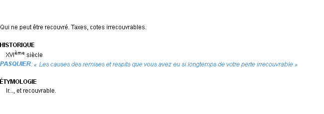 Signification éditée en 1876 pour le terme « irrecouvrable » par Emile Littré.Merci à Corin et Paule pour la numérisation du mot irrecouvrable.