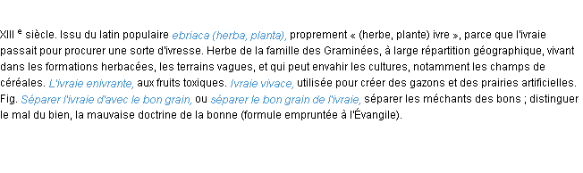 Ancienne définition « ivraie » du dictionnaire académique Français, parution de l’année 1798.Merci à Benoite et Sacha pour la numérisation du mot ivraie.