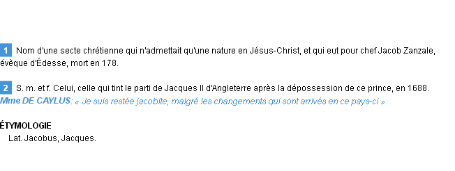 Définition de « jacobite » issue du Littré (Auteur Emile Littré, édité en 1876).