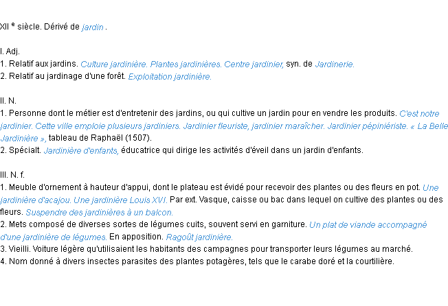 Ancienne signification issue du dico de l’Académie Française, parue en 1798.Merci à Gaspard et Patrice pour la numérisation du mot jardinier.