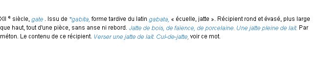 Ancienne définition du mot « jatte » par l’Académie Française (édition de 1798).Merci à Jérôme et Carole pour la numérisation du mot jatte.