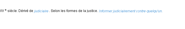 Ancienne signification développée en 1798 par l’académie Française (ACAD - 1798).Merci à Jacques et Céleste pour la numérisation du mot judiciairement.