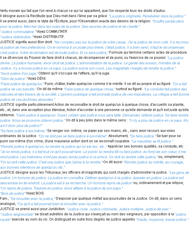 Ancienne définition du mot « justice » par l’Académie Française (édition de 1835).