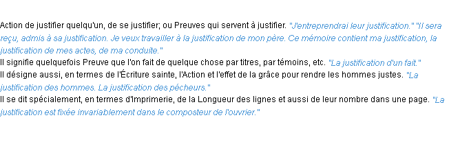 Ancienne signification du terme « justification », parution de 1798, dictionnaire académique Français.Merci à Fiacre et Nicolas pour la numérisation du mot justification.
