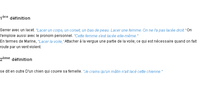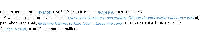 Ancienne signification développée en 1798 par l’académie Française (ACAD - 1798).Merci à Lucille et Hercule pour la numérisation du mot lacer.