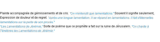 Ancienne définition « lamentation » du dictionnaire académique Français, parution de l’année 1835.