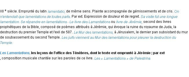 Ancienne signification éditée en 1798 pour le terme « lamentation » par l’Académie Française.Merci à Pierre et Jacques pour la numérisation du mot lamentation.