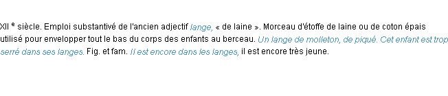 Ancienne signification issue du dico de l’Académie Française, parue en 1798.Merci à Pascal et Benoite pour la numérisation du mot lange.
