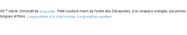 Définition développée dans dictionnaire académique, 1986.Merci à Florianne et Sacha pour la numérisation du mot langoustine.
