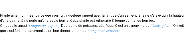 Ancienne signification parue en 17962 dans dictionnaire de l’Académie Française.Merci à Noel et Danièle pour la numérisation du mot langue de serpent.