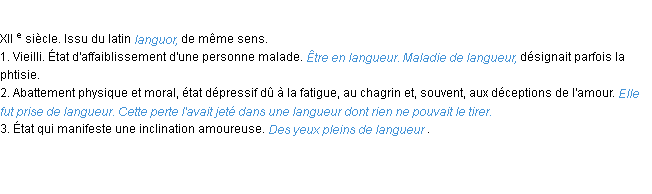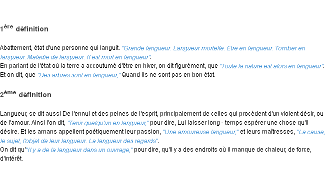 Ancienne signification issue du dico de l’Académie Française, parue en 1798.Merci à Fernande et Gilberte pour la numérisation du mot langueur.