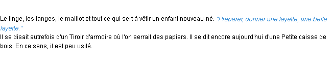 Ancienne signification parue en 1798 dans dictionnaire de l’Académie Française.Merci à Yolande et Geneviève pour la numérisation du mot layette.