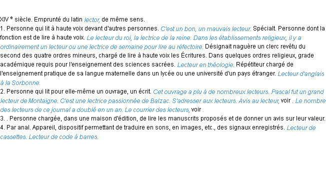 Ancienne signification du terme « lecteur », parution de 1798, dictionnaire académique Français.Merci à Lazare et Alain pour la numérisation du mot lecteur.