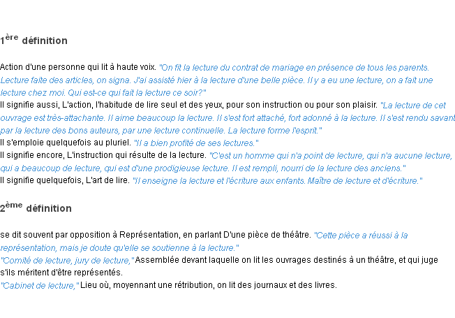 Ancienne définition de l’Académie Française (édition de 1798) pour le mot « lecture ».
