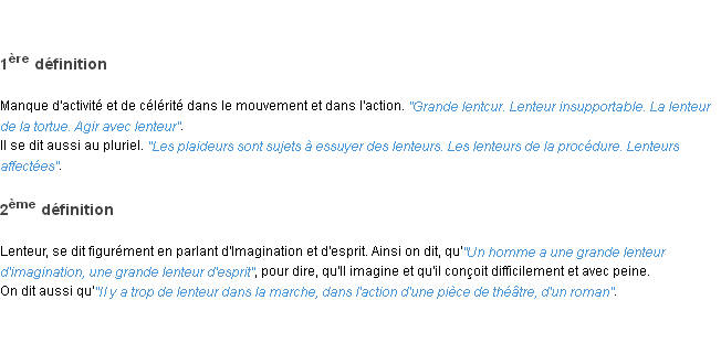 Ancienne signification parue en 1798 dans dictionnaire de l’Académie Française.Merci à émilien et Julien pour la numérisation du mot lenteur.