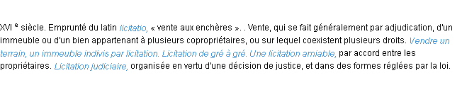 Ancienne signification éditée en 1835 pour le terme « licitation » par l’Académie Française.