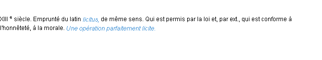Ancienne signification issue du dico de l’Académie Française, parue en 1798.Merci à Jeannette et Aurèle pour la numérisation du mot licite.