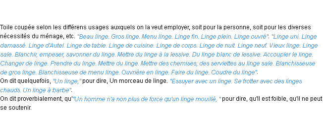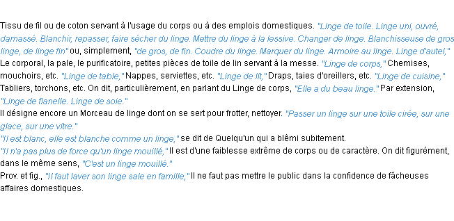 Définition de l’Académie Française (édition de 1932) pour le mot « linge ».